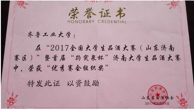 11月17-18日,我院侯周超、刘欣同学赴上海参加了全国大学生白酒品酒技能大赛决赛,济南趵突泉酿酒有限公司对济南赛区及济南赛区进入复赛、决赛的学生进行了大力资助。在整个大赛过程中,中国酒业协会、山东白酒协会分别授予齐鲁工业大学优秀组织奖,中国酒业协会授予马美范为优秀指导教师。
